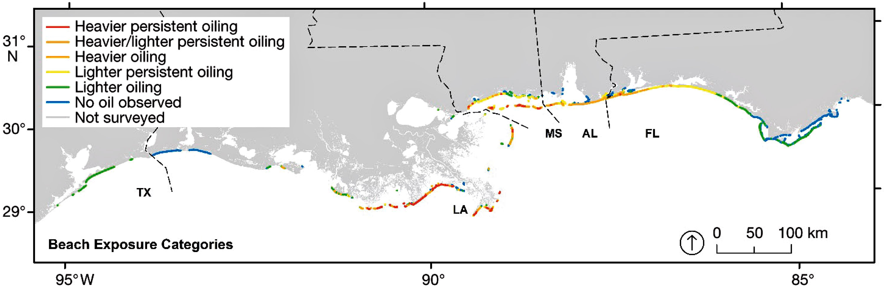 Fig. 1. Distribution of the maximum oiling category for all beaches affected by the Deepwater Horizon (DWH) oil spill. Compare with the maximum Response Injury (RI) in category per year (Fig. 6). See Nixon et al. (2016) for more detail on how oiling categories were defined and determined.